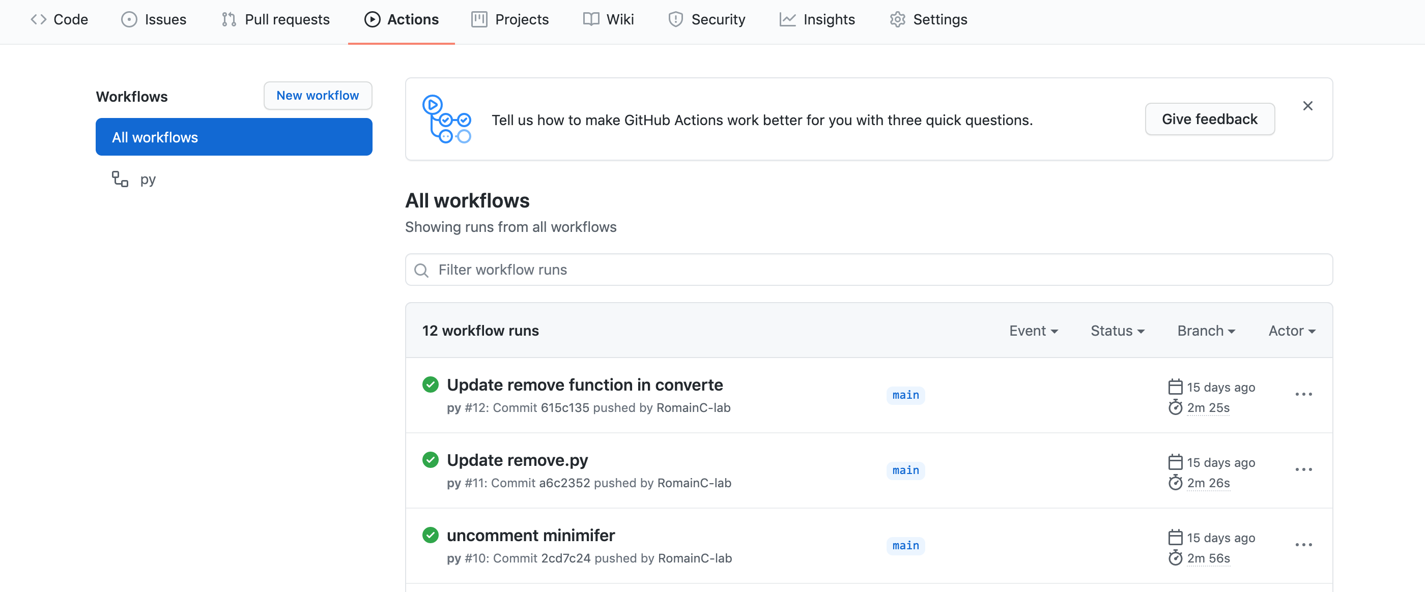 Pour finir, j'ai mis en place un workflow GitHub pour mettre à jour automatiquement le site en ligne lors d'un "commit" (action d'envoyer ses modifications locales vers un référentiel (ici GitHub) afin, d'une part, de mettre à disposition les modifications apportées à un document et, d'autre part, d'insérer de façon cohérente ces modifications dans l'historique des modifications.), pour générer les différents articles, pour minifier (action de réduire le code, avec suppression par exemple des lignes de commentaire, des retours à la ligne ...) et, enfin, pour mettre en ligne tous les fichiers HTML générés sur le serveur FTP de mon hébergeur web OVH.